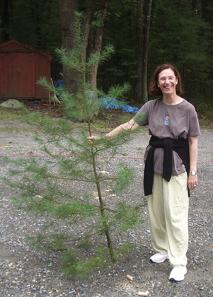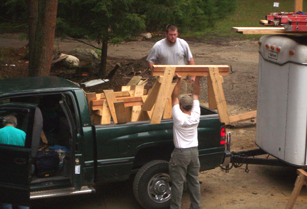 John and Sarah cut a sapling to be placed on the final ridge beam.